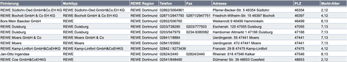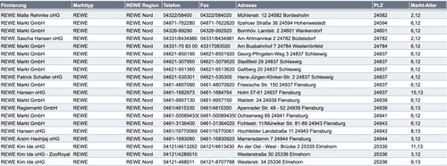 Firmierung, Markttyp, REWE Region (z.B. REWE Nord), Telefon, Fax, Adresse, PLZ, Markt-Alter (Jahre)